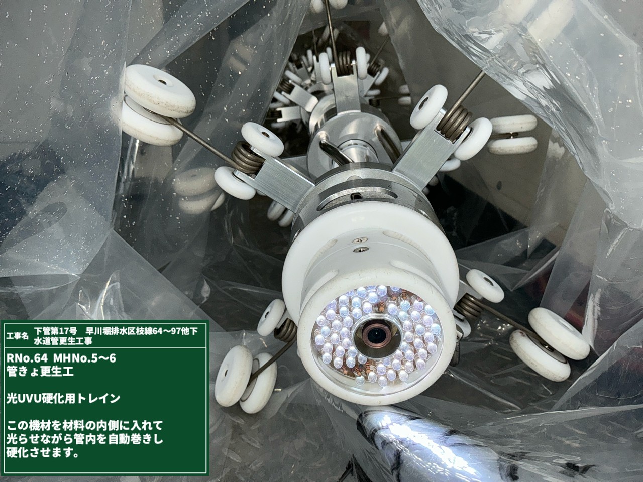 本管との接続部まで到着したら、ライニング材の状態を確認しながら光硬化の為のUVランプを点灯🔦