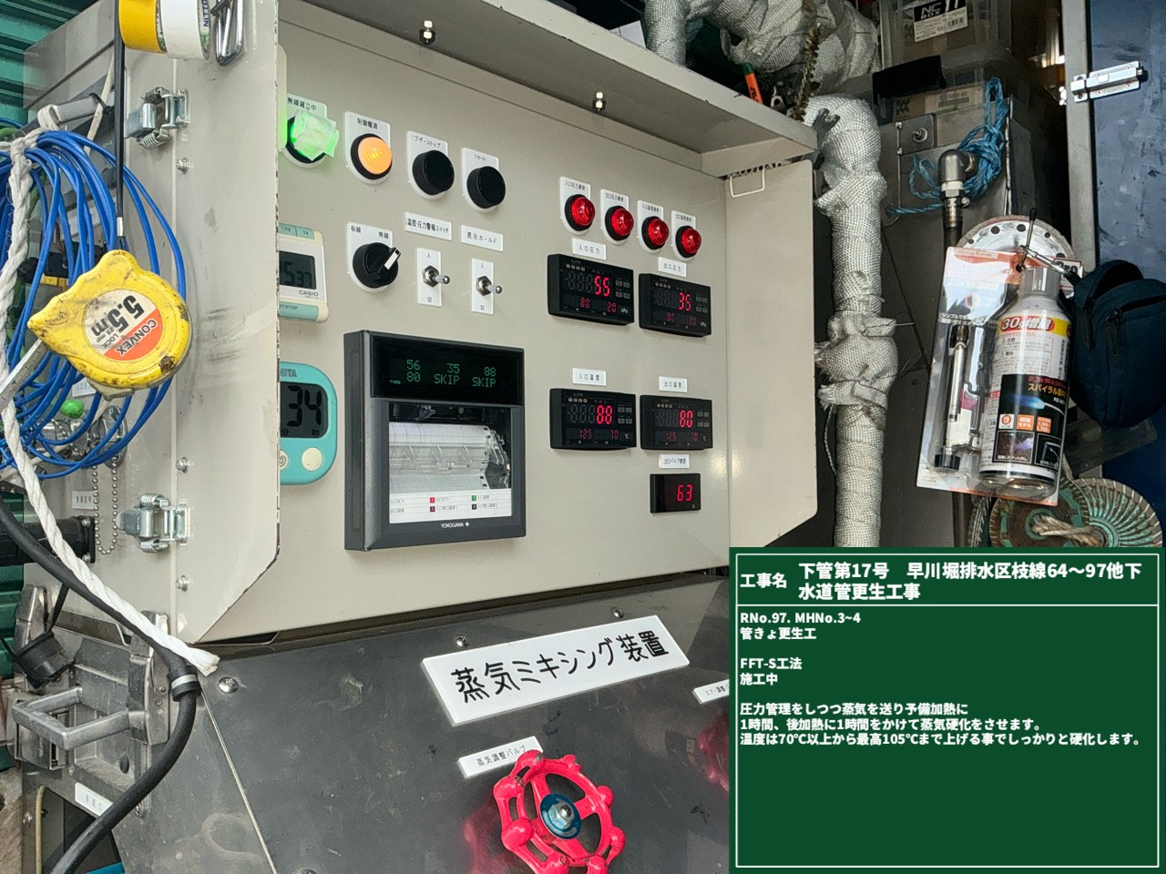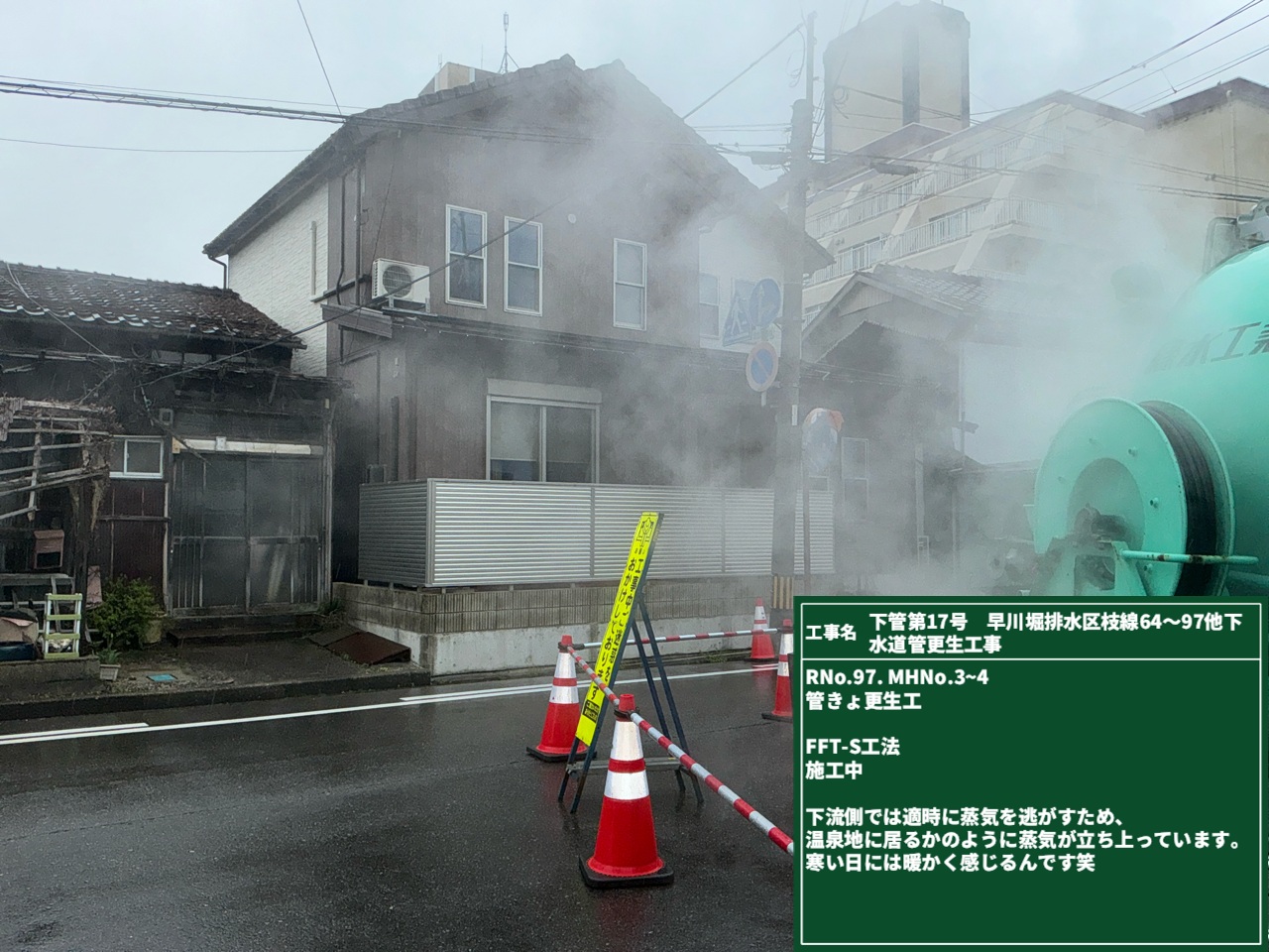 この湯気の正体は____私たちが施工している熱硬化工法でした😜