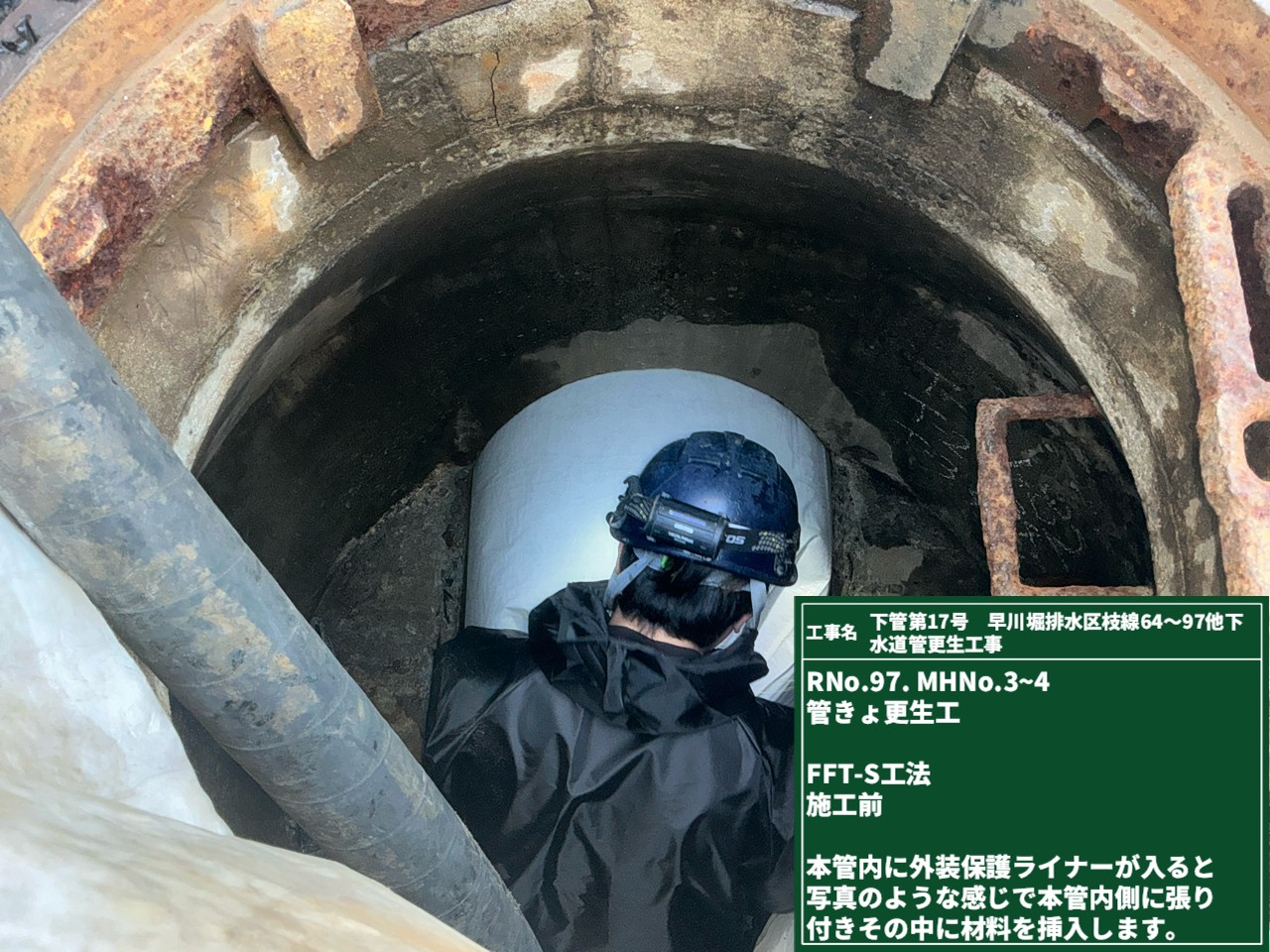 今回は本管下流側が少しカーブしているので、材料を保護する「外装保護ライナー」を先に挿入します👆